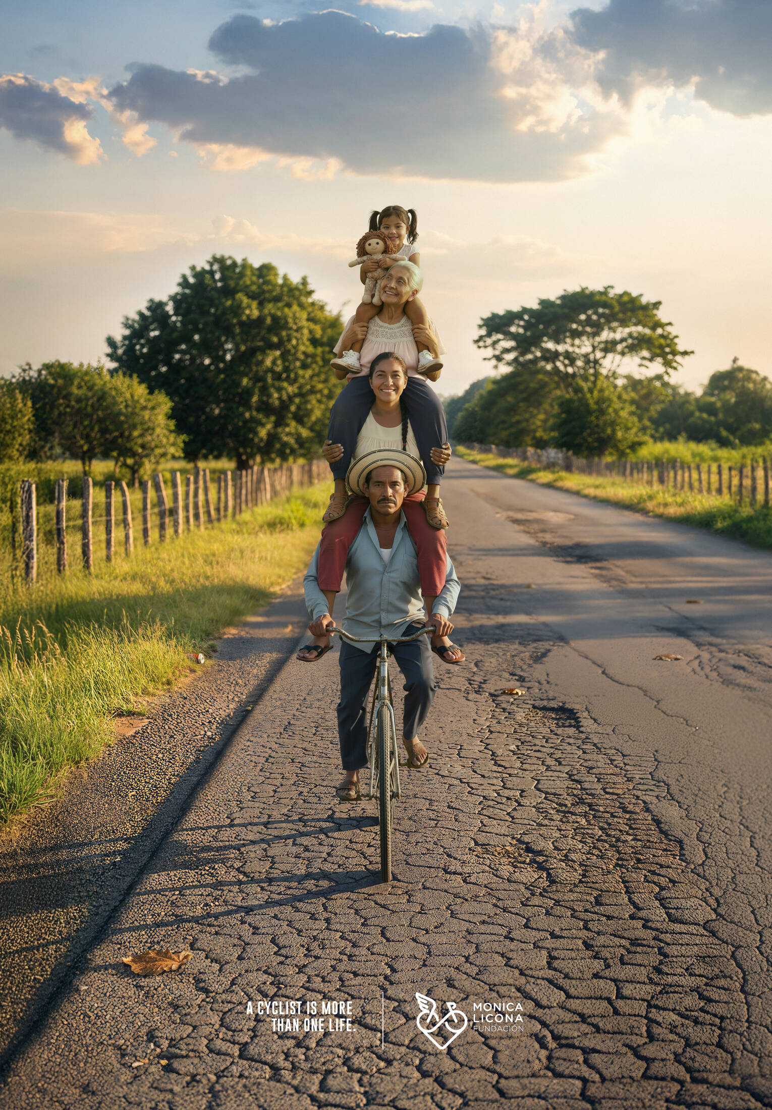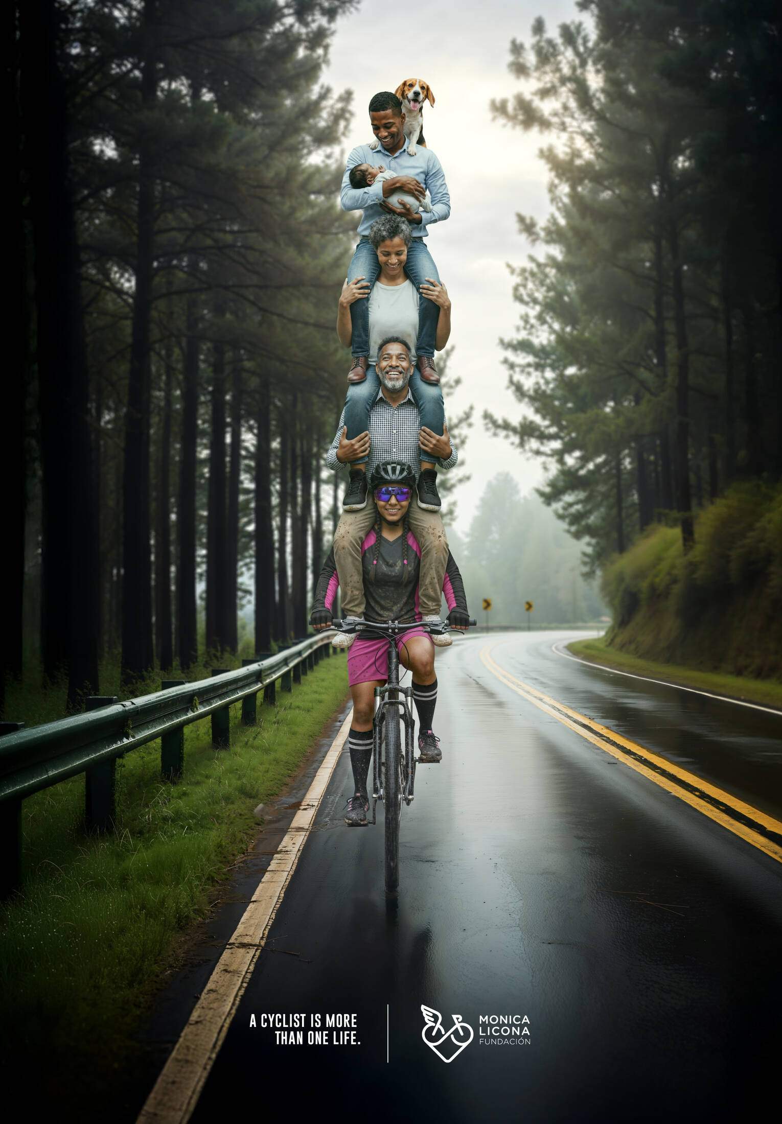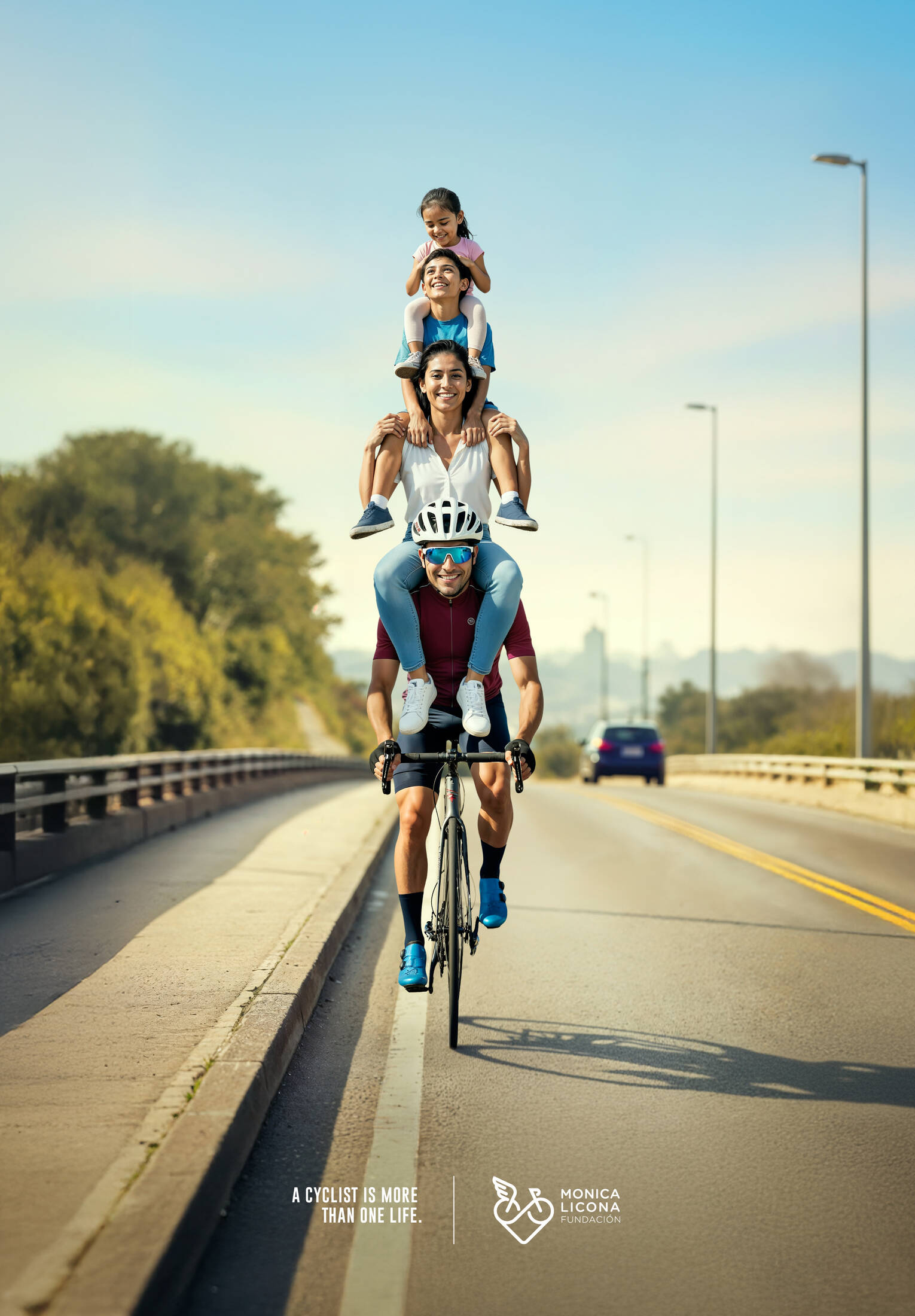 도로 위에서 자전거를 타는 사람은 절대 혼자 타지 않습니다. 각 자전거 뒤에는 이야기와 가족, 연결고리로 가득한 삶이 있습니다. 모니카 리코나 재단을 위해 자전거를 타는 사람들이 말 그대로 사랑하는 사람들을 등에 업고 등장하는 강력한 시각적 캠페인을 만들었습니다. 자전거를 타는 사람이 부딪히면 위험에 처한 것은 단 한 명의 생명이 아니라 그들을 사랑하는 모든 사람이라는 냉혹한 진실을 드러내는 은유입니다.