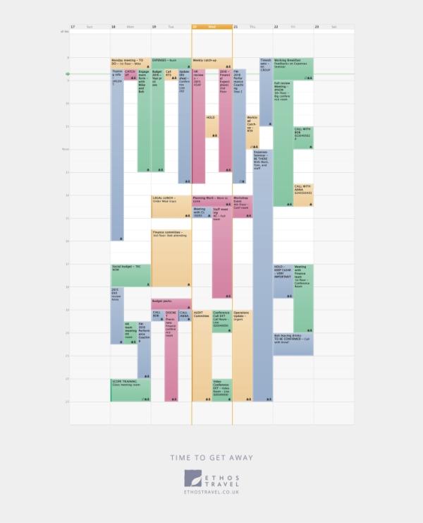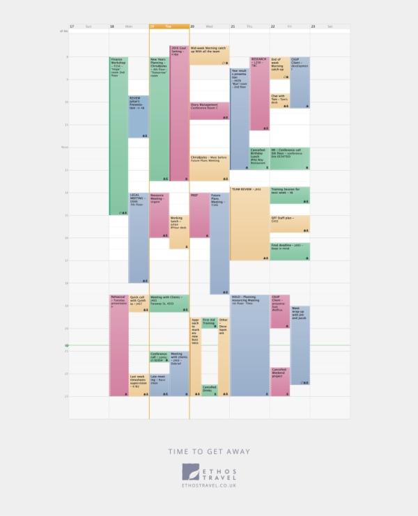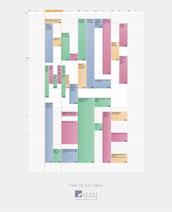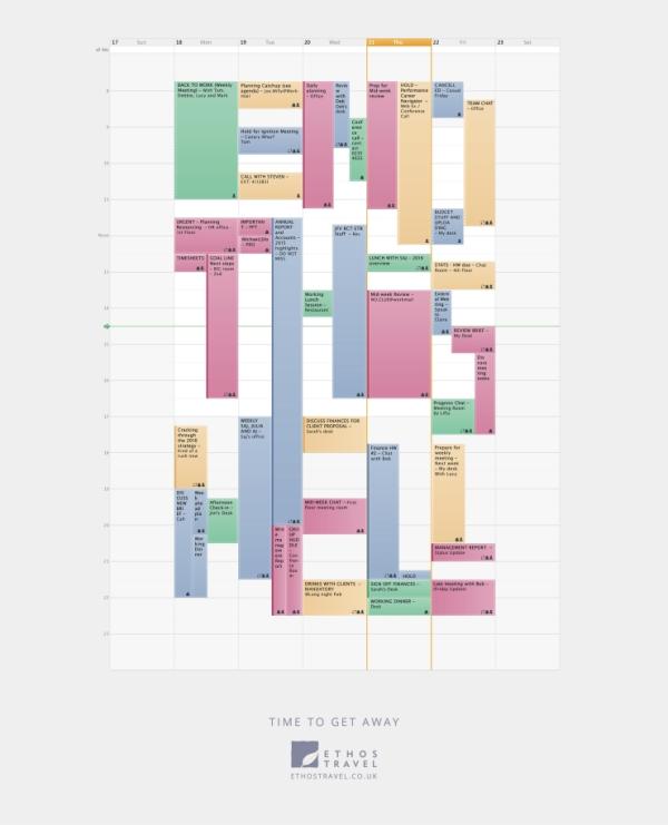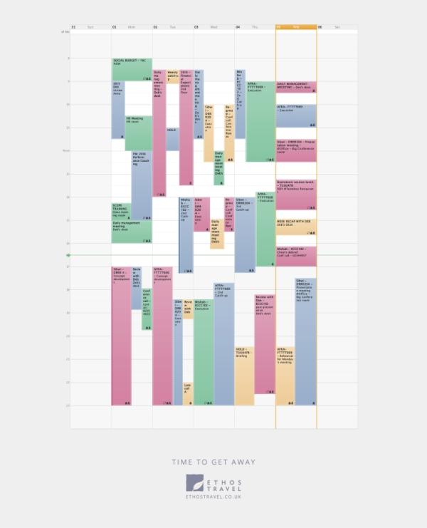 빽빽한 일상, 보기만 해도 숨이 턱 막히는듯한 시간표입니다. 시간표도 일상에서 벗어나게 해달라고 소리지르고 있네요. 시간표 모양으로 문구를 만든 아이디어가 재미있습니다. 여행사 Ethos Travel의 광고입니다 :)