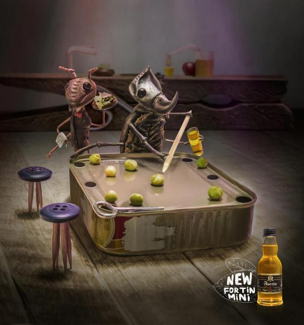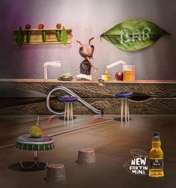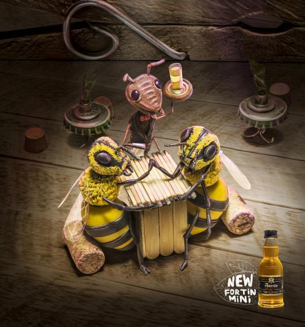 꿀벌들이 병뚜껑 탁자와 코르크 마개 의자에서 팔씨름을 하고 있습니다. 종업원인 개미는 술을 서빙하고 있네요. 새로 출시된 Fortin 사의 Fortin Mini 라는 술이 곤충들이 마실만큼 작다는 것을 유쾌하게 그려냈습니다.