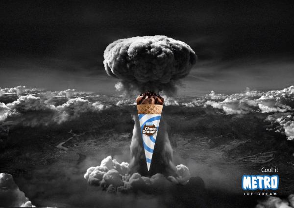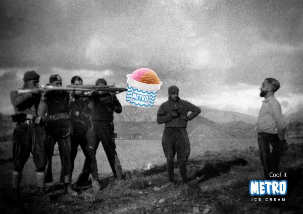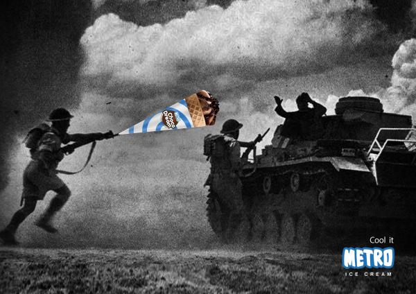 전시 상황에서 누군가 적군에게 총을 겨누고 있습니다. 그런데 황당하게 총알이 아닌 아이스크림이 날아가고 있는데요. 무기로 열내며 싸우기 보다는 시원한 아이스크림을 함께 즐기자는 유쾌한 아이스크림 광고입니다.