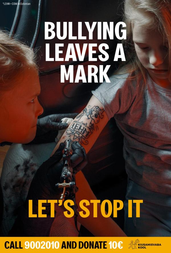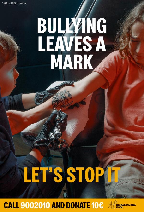 못된 표정을 한 아이들이 다른 아이들의 몸에 문신을 새기고 있습니다. 이와 함께 괴롭힘은 흔적을 남긴다는 메시지가 보이는데요. 이 인쇄광고는 누군가를 괴롭히면 그에게 평생 지울 수 없는 상처를 남기게 된다는 메시지를 담아 제작된 Kiusamisvaba Kool의 광고였습니다.