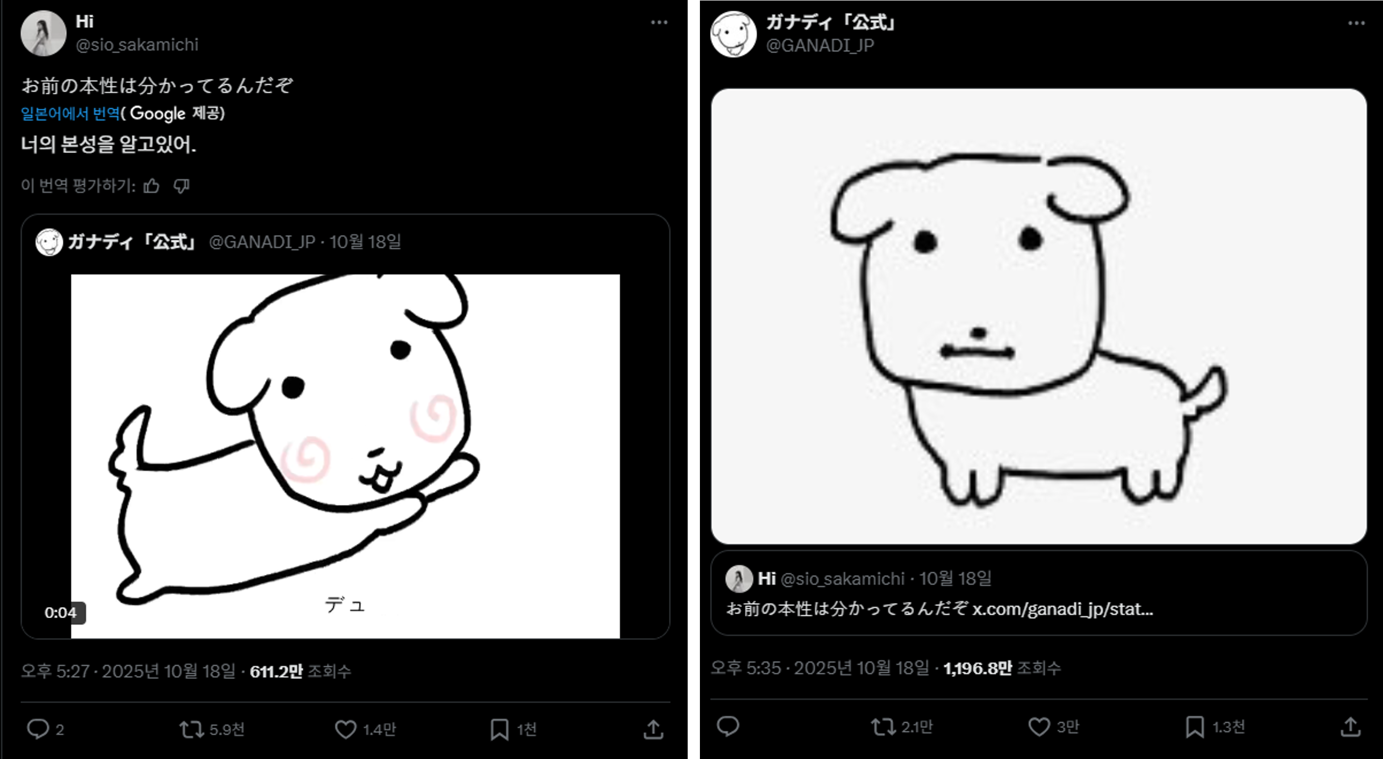 카카오톡 이모티콘 시리즈 4탄이 나올 정도로 MZ들의 많은 사랑을 받는 ‘듀 가나디’가 지난 14일 일본 공식 X 계정을 오픈했습니다. 일본에서의 이름은 가나디(ガナディ)인데요, 계정 오픈 며칠 만에 본성(?)이 드러나며 화제가 되었답니다. 사실 가나디는 귀여운 외모와 상반된 기묘한 표정이 매력 포인트거든요! 일본 X 유저들은 귀여운 그림만 업로드하는 공식 계정에 “(가나디) 네 본성을 알고 있다”, “멘헤라견(정신적으로 불안한 상태를 가리키는 일본 신조어)” 등으로 인용 댓글을 달았어요. 그러자 공식 계정에서는 정색한 가나디의 모습으로 응답했습니다. 이런 티키타카가 바이럴되며 1주일 만에 팔로워 5만 명을 모았어요. 앞으로 가나디가 일본에서 귀여운 모습만 보여줄지, 본래의 모습도 보여줄지 기대되네요!