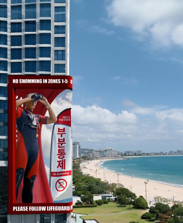 그랜드 조선 미디어는 25m×31m 초대형 규모로, 해운대 구남로의 보행자와 차량, 그리고 1.5km에 이르는 해운대 해수욕장 이용객 대부분이 볼 수 있는 해운대의 대표적 랜드마크입니다. 규모와 위치 덕분에 해운대 해수욕장 전역에서 가시성이 뛰어나 광고 효과가 매우 훌륭한 만큼, 단순한 상업용 스크린으로만 활용하기엔 아깝다는 생각도 있었어요. 이번 캠페인을 통해 기존의 육성 안내만으로는 한계가 있던 안전 메시지를 시각적으로 보완하며 초대형 미디어를 시민을 위한 ‘안전 인프라’로 재정의할 수 있게 됐습니다.