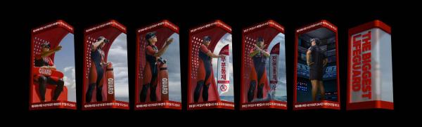 먼 거리에서도 ‘보는 즉시’ 이해되는 직관성이 최우선이었습니다. 색 대비는 분명하게, 형태는 크게 단순화하고, 3D 인물은 실제 구조대원을 활용하여 현실성을 높였어요. 스크린으로 구현된 라이프 가드는 신뢰를 기반으로 하되, 누구나 부담 없이 받아들일 수 있는 친화력을 갖추는 것이 중요했습니다. 이를 위해 통제 상황에서는 단호한 수신호를 활용했고 가장 많이 송출될 ‘안전한 상황’ 버전의 소재에선 날씨에 따라 빗방울을 손으로 느끼거나 시민들에게 인사를 건네는 등 다양한 모션을 연출했습니다.