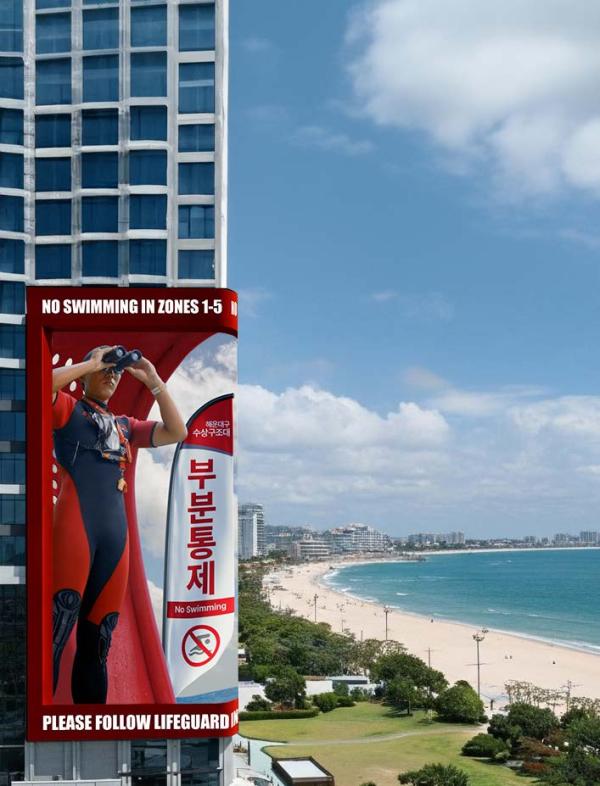 핵심 컨셉은 ‘건물만 한 라이프가드가 해운대를 지킨다’는 아이디어였어요. 진정성을 살리기 위해 실제 해운대 민간 수상구조대에서 10년 이상 활동한 구조 팀장님을 모델로 촬영했고, 25×31m 규모의 파사드는 세상에서 가장 큰 라이프가드가 해수욕객의 안전 상황을 실시간으로 살피는 초대형 망루로 구현했습니다. 또한 바다 상황을 ‘안전’-‘부분 통제’-‘전면 통제’, 세 단계로 단순·명확하게 표현하고, 라이프가드의 붉은 수트, 수신호, 튜브 등의 쉬운 이미지를 활용하여 누구나 직관적으로 상황 이해가 가능하도록 했습니다.