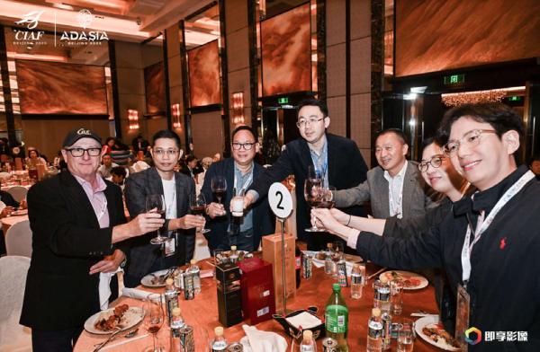 1) 애드아시아 베이징 2025에 참석하기 위해 각국에서 모인 대표단들이 웰컴파티에서 건배하고 있다.