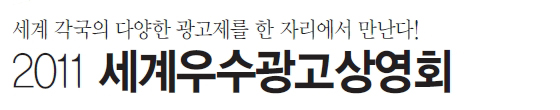 올해로 2회째를 맞는 2011 세계우수광고상영회가 지난 5월 13일부터 14일, 19일부터 22일까지 총 6일간 서울산업통상진흥원(이하 SBA) 컨벤션홀 국제회의장에서 개최되었다. 서울시와 한국광고영상제작사협회가 주최하고 한국광고단체연합회와 SBA가 주관한 이번 행사는 세계 각국의 다양한 광고제를 만날 수 있는 크리에이티브 행사로 전년에 비해 더 많은 상영작과 넉넉한 기간을 가지고 돌아왔다. 2011 세계우수광고상영회 행사 현장을 살펴본다.