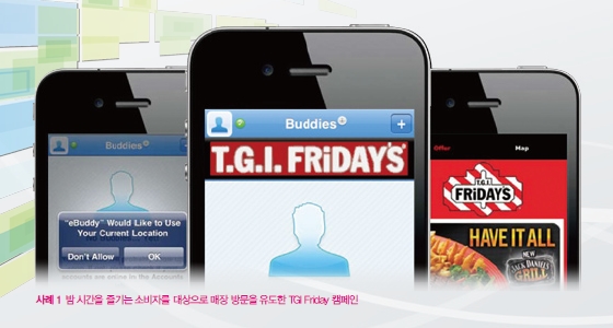 영국에서 TGI Friday는 모바일 광고대행사인 4th Screen Advertising과 위치기반 기술 회사인 Rippll의 도움을 받아 매장이나 극장 근처에서 모바일 웹을 사용하는 소비자를 표적으로 하는 디스플레이 광고 캠페인을 전개했다. ‘Make it a Premiere Night out’이라는 주제로 자신들의 브랜드와 영화 관람 행동을 연결하는 매우 효과적인 전략을 구사했다.