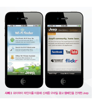 크라이슬러사의 지프(Jeep) 브랜드는 와이파이를 찾아주는 스마트폰 애플리케이션을 이용해 그랜드 체로키(Grand Cherokee)모바일 광고 캠페인을 전개했다. 지프는 지와이어(JiWire)의 와이파이 파인더(Wi-Fi Finder) 애플리케이션을 활용해 모바일 사용자가 31만 5,000 개가 넘는 장소의 디렉토리를 통해 지역의 명소를 찾을 수 있도록 했다. SUV인 지프를 소유한 소비자는 집 밖에서 여러 옥외 활동에 참여한다는 것을 가정해 이들이 모바일 애플리케이션을 통해 지프의 새로운 모델을 온라인 디렉토리를 통해 살펴보고 애플리케이션 내에서 각종 소셜 네트워크에 참여할 수 있도록 했다.