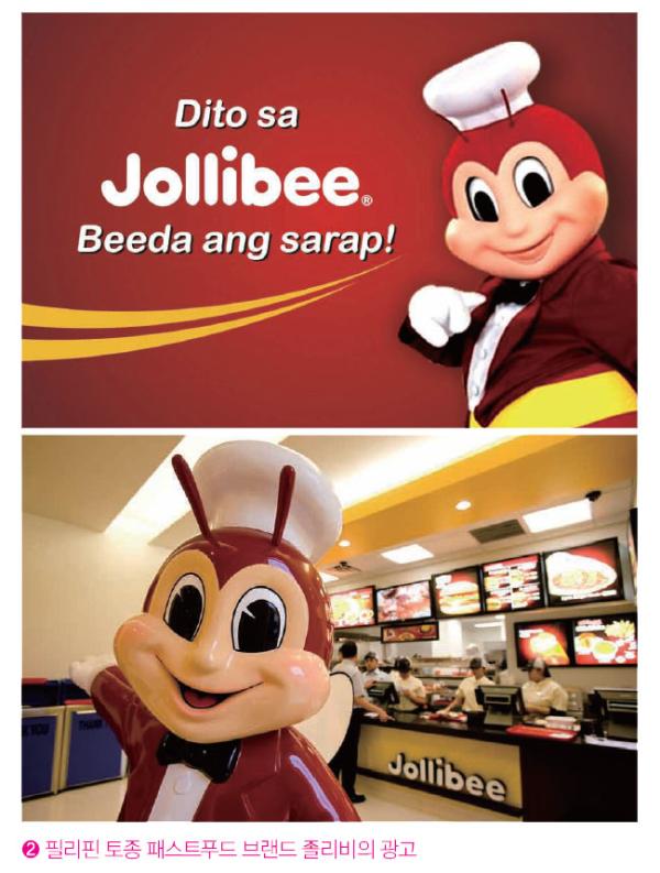 ② 전 세계 패스트푸드 매출 1위인 맥도날드도 필리핀에서는 맥을 못 춘다. 필리핀의 토종 브랜드 졸리비(Jollibee) 때문이다. 필리핀인이 졸리비를 고집하는 이유는 거대 자본력에 굴하지 않은 토종 브랜드로 애국심을 자극했기 때문이다. 여러 나라의 식민 지배를 받으면서 그들만의 것을 지키고자 한 필리핀인의 간절한 마음이 졸리비로 탄생한 것이다.