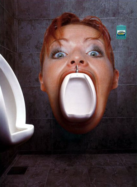 싱가포르에서 생각해 낸 쿨 민트 향의 구강관리제품 리스테린의 광고. 제목을 “소변 구취(piss breath)”라고 붙였습니다(그런데 광고에 제목이 필요하긴 한가요?). 1917년에 마르셀 뒤샹이 소변기를 하나 눕혀 놓고 “샘(The Fountain)”이라는 제목을 붙여 전시해서 사람들을 놀라게 했다는데(전시회 내내 전시장 뒤에 치워 놓았다죠?), 이건 한 술 더 뜨는군요. 게다가 의도했건 하지 않았건 다른 코드가 하나 더 들어있어 우리를 재미있게 하거나 불편하게 합니다. 어쨌든 “입 냄새에는 리스테린”이라는 메시지를 짧은 순간에 확실하게 보여주는 아이디어. 싱가포르에서는 츄잉 검을 씹지 못하게 한다니 장사가 더욱 잘 되겠네요.