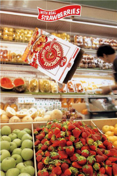 말레이지아에서 제작한 포스트 시리얼 광고. 역설적인 발상이어서 재미 있습니다. 진짜 딸기로 만들었다는데 딸기는 아래 쪽에 있으니까요. 딸기들이 힘을 다해 제품으로 올라가기라도 해야겠군요. 쉬운 사실을 말 그대로 쉽게 표현했습니다. 그런데 인쇄광고인지 앰비언트(ambient) 미디어의 활용인지 잘 모르겠네요. CD를 다음에 만나면 물어봐야겠습니다.