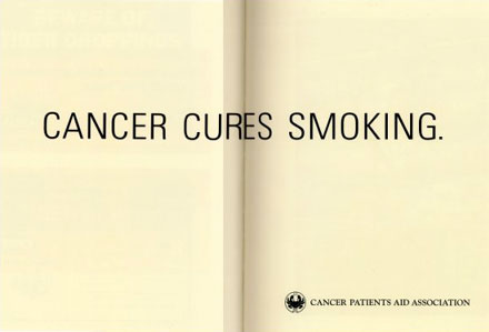 “암이 흡연을 치료해 줍니다(Cancer cures smoking.)”. 당연하지요. 일단 암에 걸리면 끝으로 가는 확률이 높아지는 것이니까 흡연쯤이야 아무 것도 아니겠지요. 역시 뭄바이의 같은 팀이 낸 아이디어입니다. 이 장면에서 “나 죽은 다음에 천만금을 받으면 뭐해?” 라는 보험회사 카피가 생각납니다. 죽기 전에 잘 삽시다.