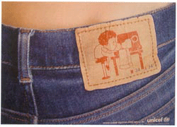 청바지의 태그에는 바느질하는 아이가, 셔츠 왼쪽 가슴엔 목화솜을 따는 아이가, 운동화의 로고 부분에는 신발을 풀칠하는 아이가 그려져 있는 광고입니다. 당신이 무심코 착용하는 이런 옷과 신발이 제3세계 어린아이의 노동착취를 통해 생산되는 것이라는 사실을 변화된 로고 형태를 통해 풀어냈습니다.