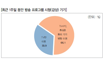 디지털 디바이스 보유율이 높은 만큼 방송 프로그램 감상에 있어서도 NOMP는 매우 다양한 시청 행태를 나타낸다. 최근 1주일 동안의 방송 시청 기기를 묻는 질문에 단 33.9%만이 TV를 통해 감상하였고, 66.1%는 TV와 함께 PC(인터넷)나 휴대폰 등의 다른 기기를 병행하여 감상하였다고 응답하였다.