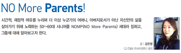 확실히 지금의 5060 세대는 이전의 5060 세대와 다르다. 이제 따로 잔치를 열어 환갑을 축하하는 것이 민망할 정도로 NOMP 세대가 젊어지고 있다. 그 동안의 NOMP가 은퇴 후의 약하고, 무기력한 세대로 대변되었다면 지금의 NOMP는 퇴직 후 적성에 맞는 제 2의 직업을 찾거나 취미, 사회공헌 활동 등에 적극적인 세대로 변모해 가고 있다.