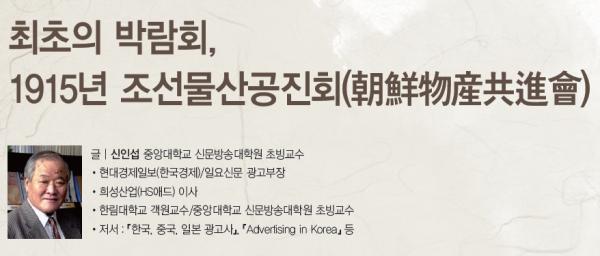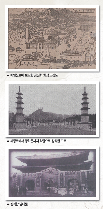 일제강점 5년이 지난 1915년 일본은 서울 경복궁에서 한국 최초의 본격적 박람회를 개최한다. 이름은 “조선물산공진회”. “공진(共進)”이란 함께 나간다는 뜻이니 일본이 한국을 강점한 5년 뒤에 같이 발전한 모습을 보인다는 숨은 뜻이 있는 이름이다. 기간은 9월 11일부터 10월 말까지 50일. 예산의 일부는 일본 의회의 승인을 받을 만큼 큰 행사였다. 간단히 말하자면 일본의 대대적인 조선 합병 선전이었다.