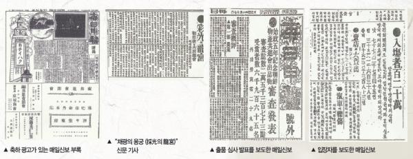 매일신보는 원래 1904년 영국인 배설(裵說. Ernest T. Bethel)이 창간해서 국·영문, 한글판, 한문과 한글 판으로까지 발전한 대한매일신보(大韓每日申報)를 합병한 뒤 매일신보(每日申報)로 이름을 바꾸었다. 매일신보는 유일한 조선어 일간신문으로 조선총독부 기관지로 만든 이 신문은 연일 공진회 보도를 했고 아울러 부록도 발행했다. 회장인 경복궁의 조감도와 평면도를 자세히 보도했다. 9월 11일 오전 9시 경복궁 근정전에서 조선총독의 개회선언으로 공진회가 개막했다. 관람은 주간과 야간에도 있었다. 밤하늘을 환하게 비친 공진회장은 틀림없는 구경거리였을 것인데 매일신보는 ‘채광의 용궁(採光의 龍宮)’이라 했다. 이 신문에는 연일 공진회 기사와 사진 보도가 있었고 아울러 여러 회사, 상점들의 축하 광고가 즐비했다.