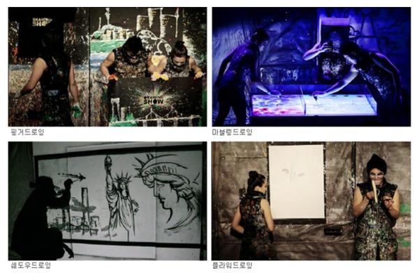 미술을 활용한 공연이 드로잉쇼만 있는 건 아니다. 광고에 쓰여 화제를 모았‘던샌 드애니메이션’이나 비눗방울을 이용해 다양한 퍼포먼스를 펼치는‘ 버블쇼’ 역시 다양한 버전으로 공연되고 있다. 또 어린이들을 위한 미술체험형 공연 ‘노리아츠’ ‘가루야, 가루야’ 등도 선호도가 높다. 하지만 이들 공연과 드로잉쇼의 차별점은 다채로움에 있을 것이다. 하나의 재료(모래·비눗방울·밀가루 등)만을 사용하는 타 공연들은 한두 퍼포먼스를 보고 나면 쉽게 다음을 예상할 수 있고, 재료의 한계가 있는 등 장시간 공연을 진행함에 자칫 지루해질 요소가 많다.