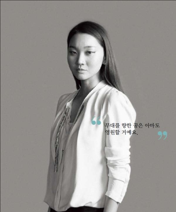 장윤주: 멋있게 말해야 할텐데…(웃음) 노래 부르는 무대에서 느꼈어요. 제가 그때까지 해왔던 패션 무대와 이 무대가 다르다는 것을요. 무대에 오르는 순간에는 항상 이런 생각을 하게 되요. ‘영원했으면 좋겠다’라고. 그것은 이루어질 수 없는 꿈이지만, 영원하기를 바라는 순간을 가져보았다는 것도 행복이겠죠? 그리고 그런 느낌은 무대 위에서 가장 강렬하게 느껴요. 그래서 나의 무대는 ‘영원하기를 바라는 순간’입니다.