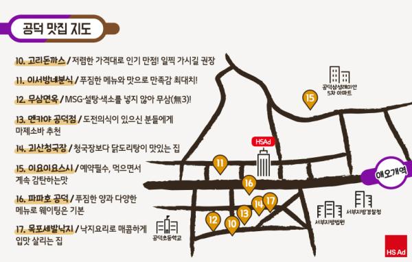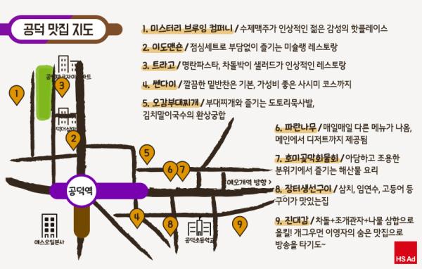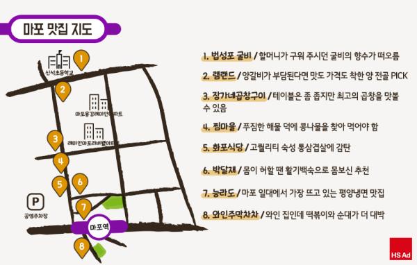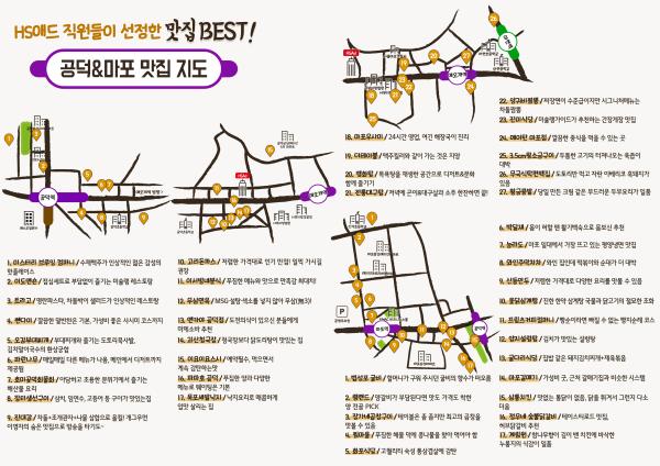‘오늘 뭐 먹지?’ 직장인들의 영원한 고민! 직장인의 하루 중 가장 즐겁고 소중한 순간인 점심시간을 더 맛있고 풍성하게 보내고 싶어도, 매일 가는 곳만 가게 되는 것이 현실이기도 합니다. 인터넷에 맛집 검색을 해 봐도 왠지 ‘짜고 치는 블로그’ 같은 의심이 들어 믿을 수 없다면? HS애드 직원들이 직접 선정한 지하철 공덕역?마포역 및 서래마을 맛집을 참고해 보세요! 지투알/HS애드/LBEST 임직원 여러분들이 아낌없이 공유해주신 회사 근처 맛집 리스트와 맛집 지도가 드디어 완성되었습니다~ 두둥! 불펌 환영, 무단게재 권장! 페이스북, 인스타그램, 네이버 블로그, 트위터 등 어디라도 퍼 가셔도 좋고, 클라이언트에게, 협력사에게, 마음껏 전달하셔도 좋습니다!