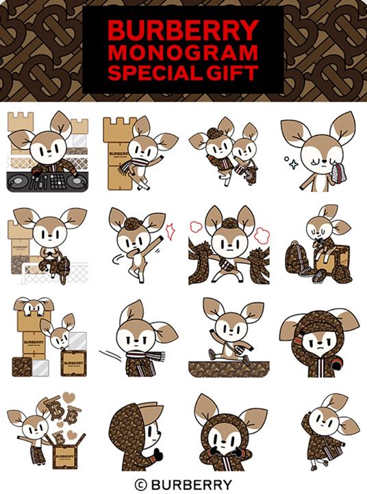 버버리는 지난 6월 새로운 모노그램 컬렉션 출시와 팝업스토어 론칭을 기념해 이모티콘을 선보였다. 케이코믹스가 개발한 사슴 캐릭터에 ‘토마스 버버리 모노그램 컬렉션’을 입혔는데, 사슴이 이렇게 버버리를 잘 소화할지 미처 몰랐다. 심지어 이 사슴은 요즘 전 세계적으로 유행하는 망치춤까지 출 줄 안다. 아기 사슴 밤비 이후로 이렇게 귀여운 사슴을 만나긴 실로 오랜만이다.