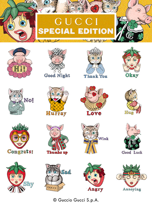이탈리아 브랜드 구찌는 카카오 플러스 친구 론칭 1주년을 기념해 지난 7월 25일 스페셜 에디션 이모티콘을 발매했다. 지난해 ‘스페셜 에디션 심볼’ 이모티콘을 선보였던 구찌는 이번에는 돼지와 고양이, 딸기 등의 앙증맞은 캐릭터들에게 위트 있는 감성까지 더했다. 딸기가 이렇게 새침한 과일이었던가?