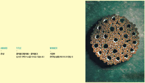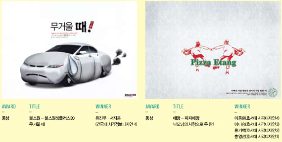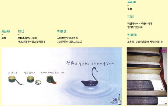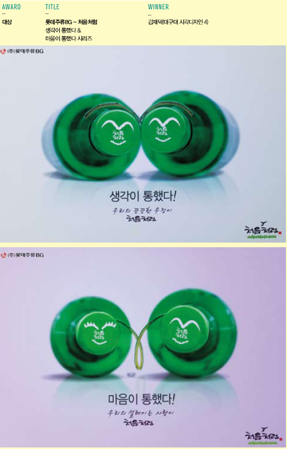 대상을 받은 ‘처음처럼 - 생각이 통했다 & 마음이 통했다 시리즈’ 편은 소비자를 미소 짓게 하는 비주얼과 카피, 브랜드명을 카피와 자연스럽게 연결해 다시 한 번 강조한 점이 좋은 평가를 받았다. 은상 수상작인 ‘공익광고 - 당신은 연탄가스를 마시고 있습니다’ 편은 심플한 비주얼로 강렬한 메시지를 전달한 점이 좋은 평가를 받았다. 동상을 받은 ‘청하 - 백조처럼 우아하고 깔끔하게’ 편은 제품 내용을 유머러스하고 귀엽게 표현해 여성 소비자에게도 어필한 점이 좋은 점수를 받았다.