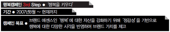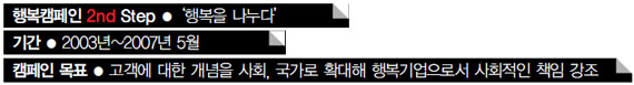 이 시기 소비자들은 고객 행복에 대해 인식하기 시작했기에 SK그룹은 행복에 대한 가치를 확대할 필요가 있었다. 따라서 행복의 대상, 고객을 소비자로 한정 짓는 것이 아닌, 사회와 국가로 확대해 기업의 사회적인 책임을 강조하기 시작했다. 그러면서 캠페인의 소재들 또한 다양해졌고, ‘농어촌인터넷자원봉사’,‘ 불우어린이공부방’,‘ 인형극자원봉사’등SK그룹의다양한사회공헌 활동들이 실제 광고 소재로 활용됐다.