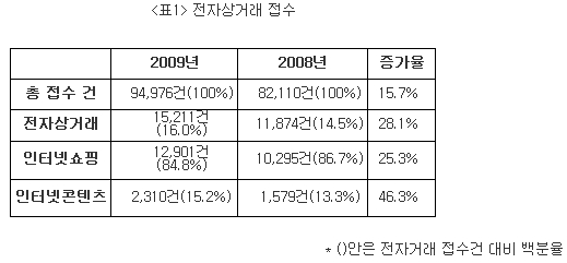 2009년 소비자연맹에 접수된 전자상거래 관련 고발은 총 15,211건으로 전체 고발 접수 건 94,976건의 16%를 차지했다. 이는 2008년 전자상거래 관련 고발 11,874건 보다 28.1%나 증가한 것으로 총 접수 건 증가율 15.7%를 크게 웃돌았다. 전자상거래 관련 고발 중에서도 특히 인터넷 콘텐츠 관련 고발은 2,310으로 2008년 대비 46.3%나 증가하여 증가세가 두드러졌다.
