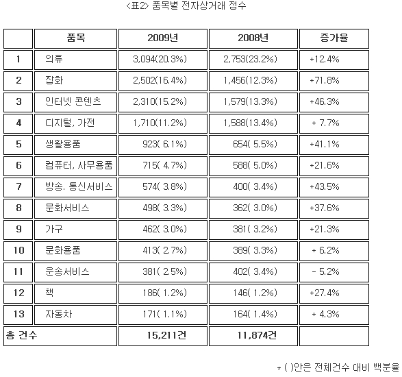전자상거래 관련 고발 중 가장 접수가 많이 된 품목은 의류로 3,094건이 접수되어 전체의 20.3%를 차지하며 잡화 2,502건(16.4%), 인터넷콘텐츠 2,310건(15.2%), 디지털 가전제품 1,710건(11.2%), 생활용품 923건(6.1%)의 순으로 접수됐다. 전년(08년) 대비 증가율이 가장 두드러진 품목은 잡화로 2,502건이 접수되어 71.8%가 증가됐고 인터넷 콘텐츠 관련 접수도 2,310건으로 46.3%가 증가했다.