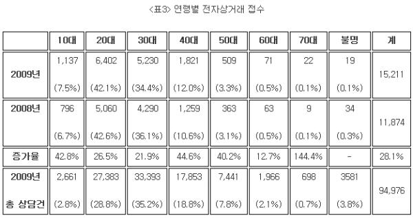 전자상거래 관련 피해를 가장 많이 접수한 연령층은 20대로 전체의 42.1%이다. 30대는 5,230건(34.4%), 40대는 1,821건(12.0%), 10대는 1,137건(7.5%)으로 나타났다. 전자상거래 관련 고발이 가장 큰 폭으로 증가한 연령대는 70대로 2.5배가 증가했고 40대의 경우 44.6%, 10대의 경우 42.8%가 증가하여 증가세가 두드러졌다. 20대의 경우 전체 접수 건에서 차지하는 비중은 28.8%인데 비해 전자상거래 관련 고발에서 차지하는 비중은 42.1%였고, 10대 역시 전체 고발 건에서 차지하는 비중은 2.8%로 미비한데 비해 전자상거래 관련 고발의 비중은 7.5%로 비교적 높았다. 전체 고발 접수에서는 50대 이상 연령층이 10.6%인 반면 전자상거래 관련 접수는 3.9%에 지나지 않았다.