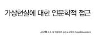 - 인식 가상현실(Virtual Reality, VR)은 우리를 또 다른 세계로 안내하는 최첨단 기기나 소프트웨어만을 비유하지 않는다. 물론 가상현실은 1968년 서덜랜드(I. Sutherland)가 사이버 헬멧을 쓰면서 등장했기에, 과학기술의 발전은 필연적인 조건이라고 할 수 있다. 하지만...
